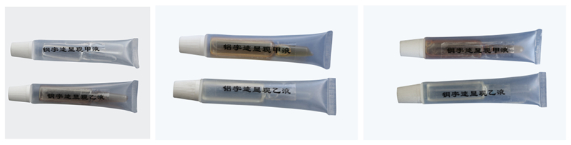 显现铜字迹的试剂是“铜字迹甲液”和“铜字迹乙液”。按钢字迹的显现方法剪开两个试剂的套管封口、砸碎套管内的玻璃瓶,使试剂可以从封口出流出。交替点滴“铜字迹甲液”和“铜字迹乙液”,直至潜在字迹出现。