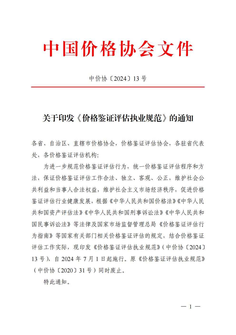 中价协[2024]13号关于印发《价格鉴证评估执业规范》的通知