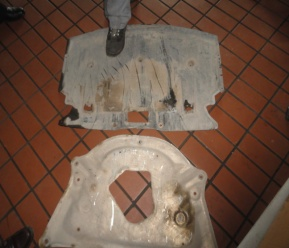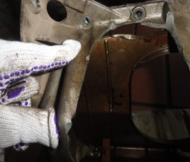 发动机铝质油底壳左部(朝向轿车前方一侧)有一个约15×35cm的不规则的破损孔洞,在孔洞断口边棱上出现多处点状的平滑痕迹(图七),处在油底内的隔油板右端的凸棱卷曲,该处和油底的上口几乎等高。 说明发动机铝质油底壳的破损不是一次性碰撞事故形成,点状形光滑痕迹是被金属物击打而形成的,与水泥基座和其上的地脚螺栓不具有造痕体与承痕体的关系。